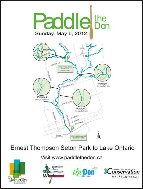 Paddle the Don River – May 6, 2012 Join us for the annual Manulife Paddle the Don River day on Sunday May 6, 2012. This 2-3 hour paddle starts at Ernest Thompson Seton Park (enter via Wilket Creek Park on the west side of Leslie Street, north of Eglinton Ave East) and winds its way south for about 10 km to the Keating Channel at Lake Ontario. Members of the WCA will be helping out as volunteer weir watchers along the way. The river is flooded for this event so there will be moving water, swifts and rapids. There are three weirs; the first two must be portaged and the third may be run. Bring your white water canoe, paddling gear for cold water, and a camera. The river offers a unique view of the city landscape, city wilderness and maybe wildlife. The takeout is located at 170 Villiers Street at the northwest corner of Villiers Street and the Don Roadway. Here you will find free entertainment and food and drink for purchase (or you can bring your own lunch). A free shuttle bus will take you back to the start where you can pick up your car and drive back to the takeout to pick-up your canoe. This event is free, but you must register in advance. It fills up quickly, so register early. You can also help raise money to support regeneration projects within the Don watershed by completing a pledge form from the website. Go to http://www.paddlethedon.ca/ for more information and to sign up for 2012 event notifications.
